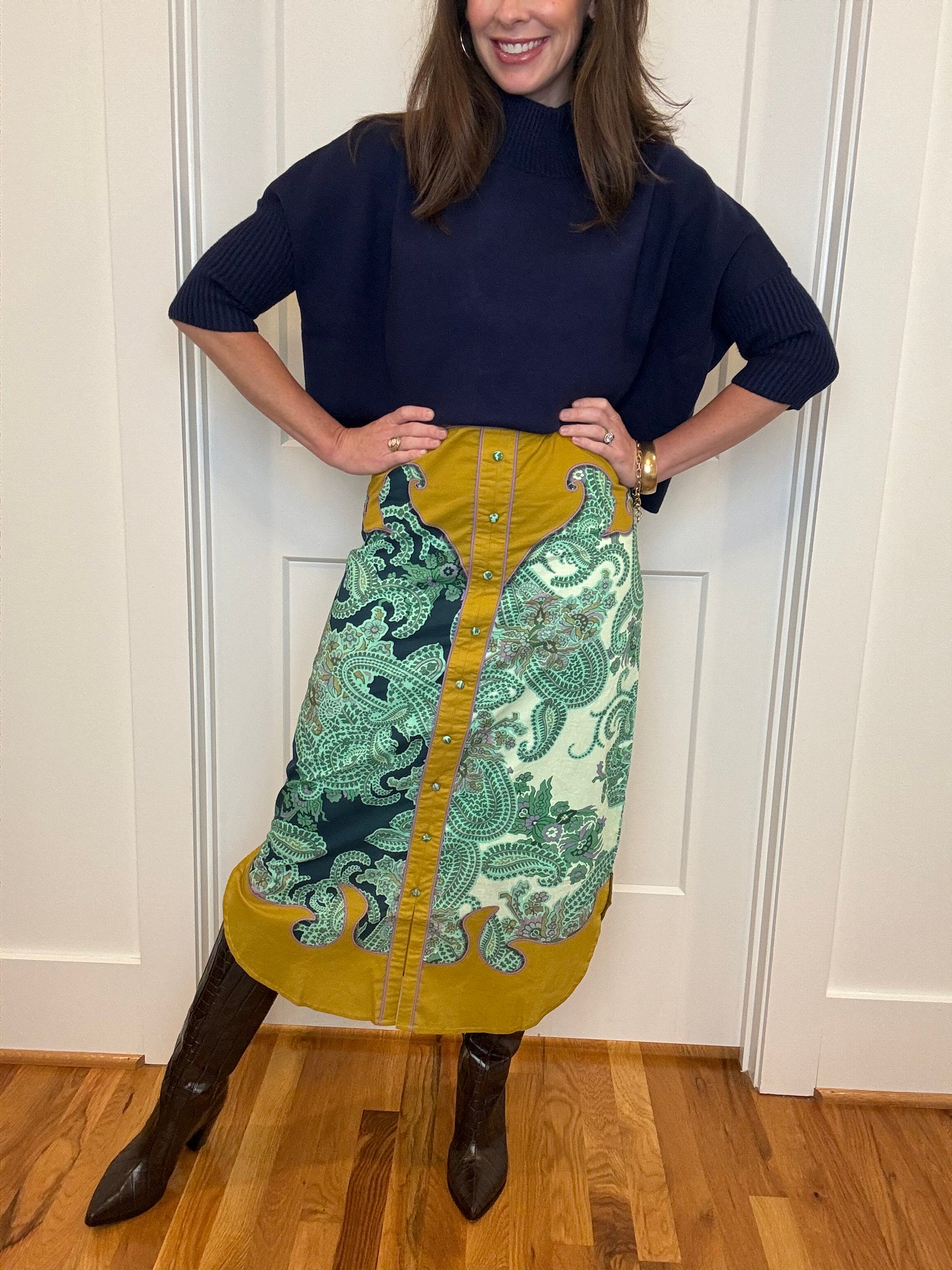 The Portia Skirt boasts a streamlined body and front slit for a sleek and modern look. With buttons down the middle and a unique print mix, this skirt is a versatile and stylish addition to any wardrobe. Perfect for effortlessly elevating any outfit.