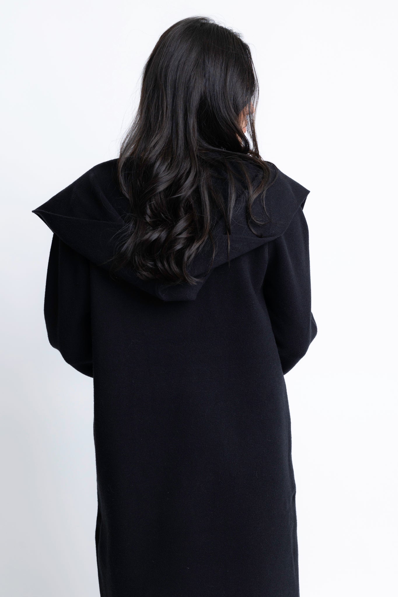 Black sweater hooded cardigan coat.
