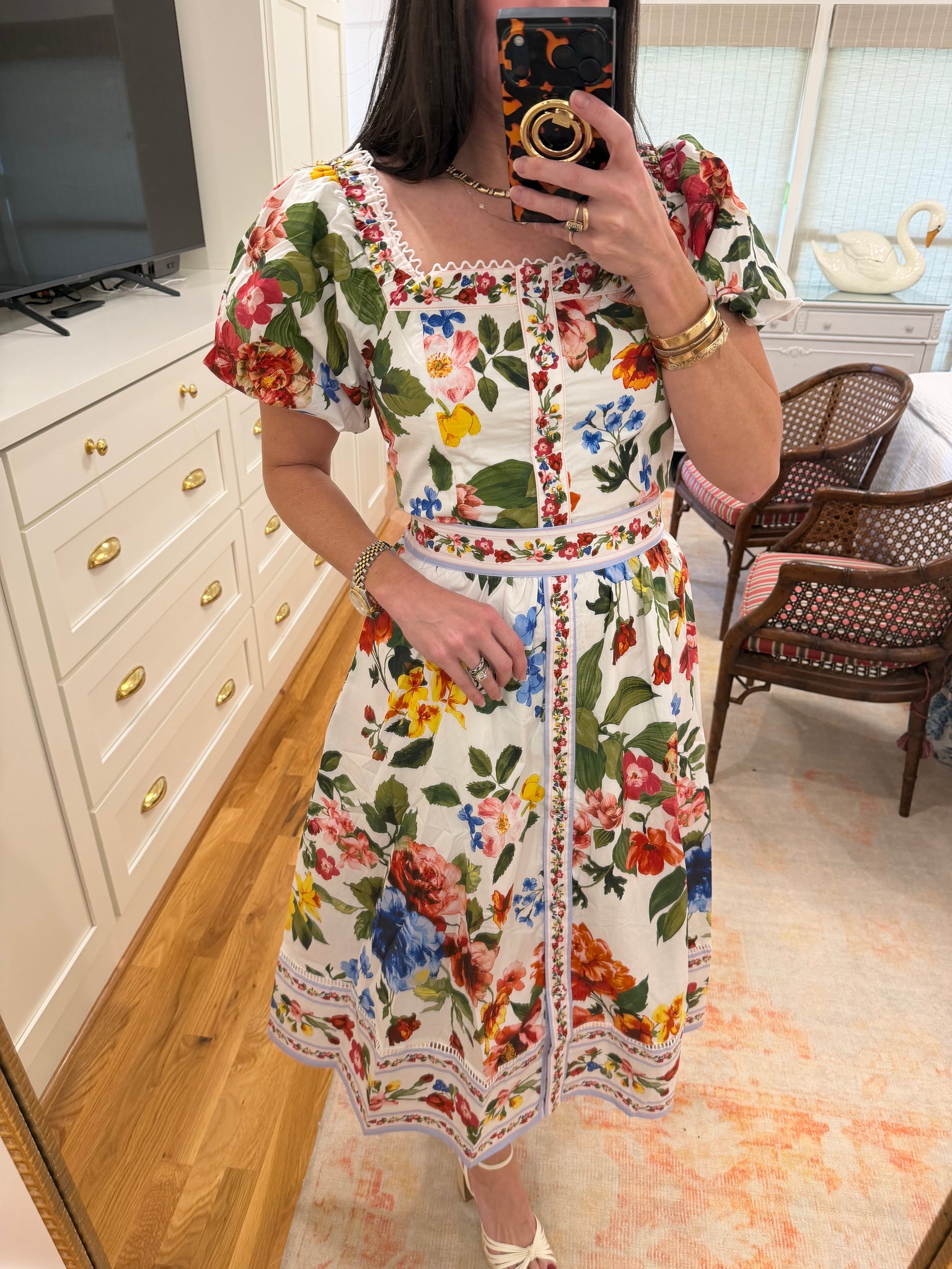 Floral puff sleeve top with midi skirt.