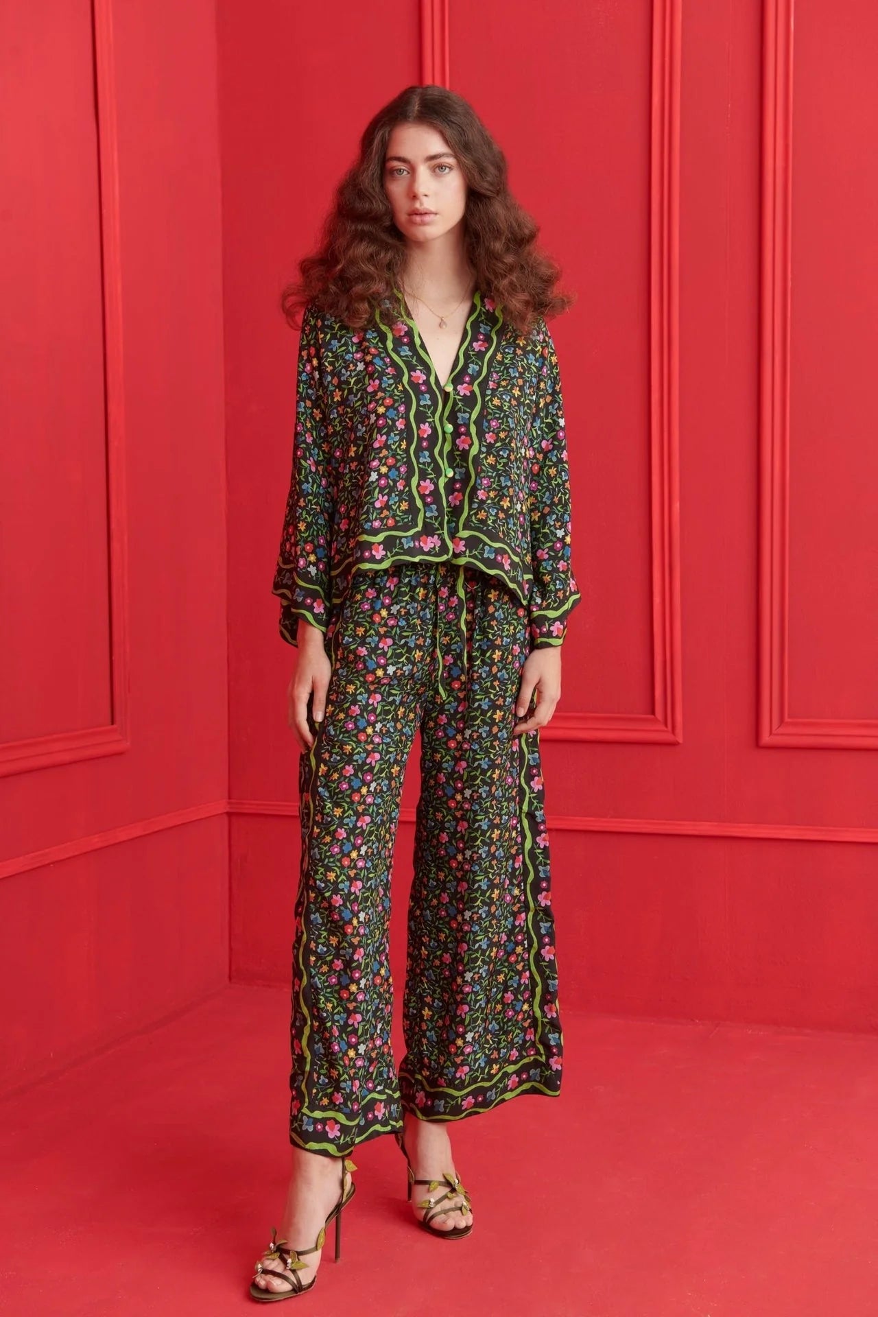Bold yet breezy, the Hala Pants are designed for effortless elegance. With a loose, wide-leg cut and an elasticated waist, they offer comfort without compromising on style. The vibrant all-over floral motif is framed by striking green piping over a midnight-black base for a refined finish. They also feature side pockets for added functionality. Perfect as a set or styled solo.