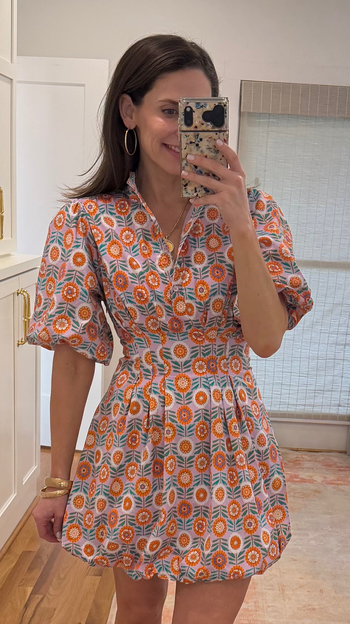 Fun lavender and orange floral print on a bubble hem poplin dress. Elastic waistband in the back provides added comfort.