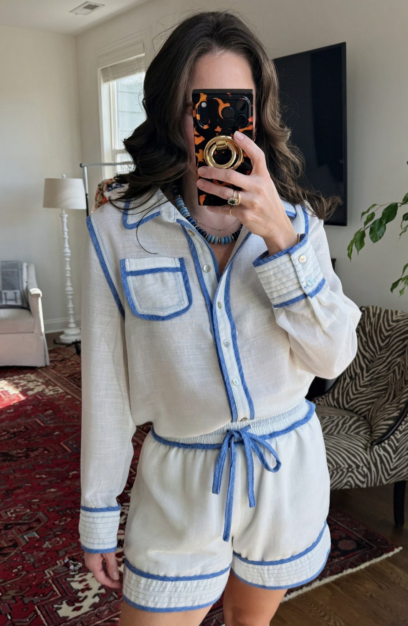 Blue & White Button-Up Shorts Set
