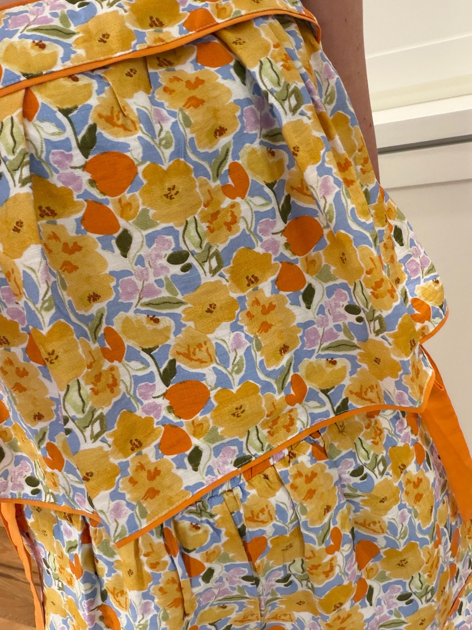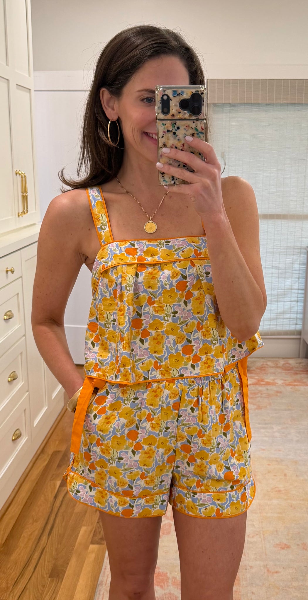 Orange floral short set. Adjustable straps, elastic waistband and pockets on shorts.